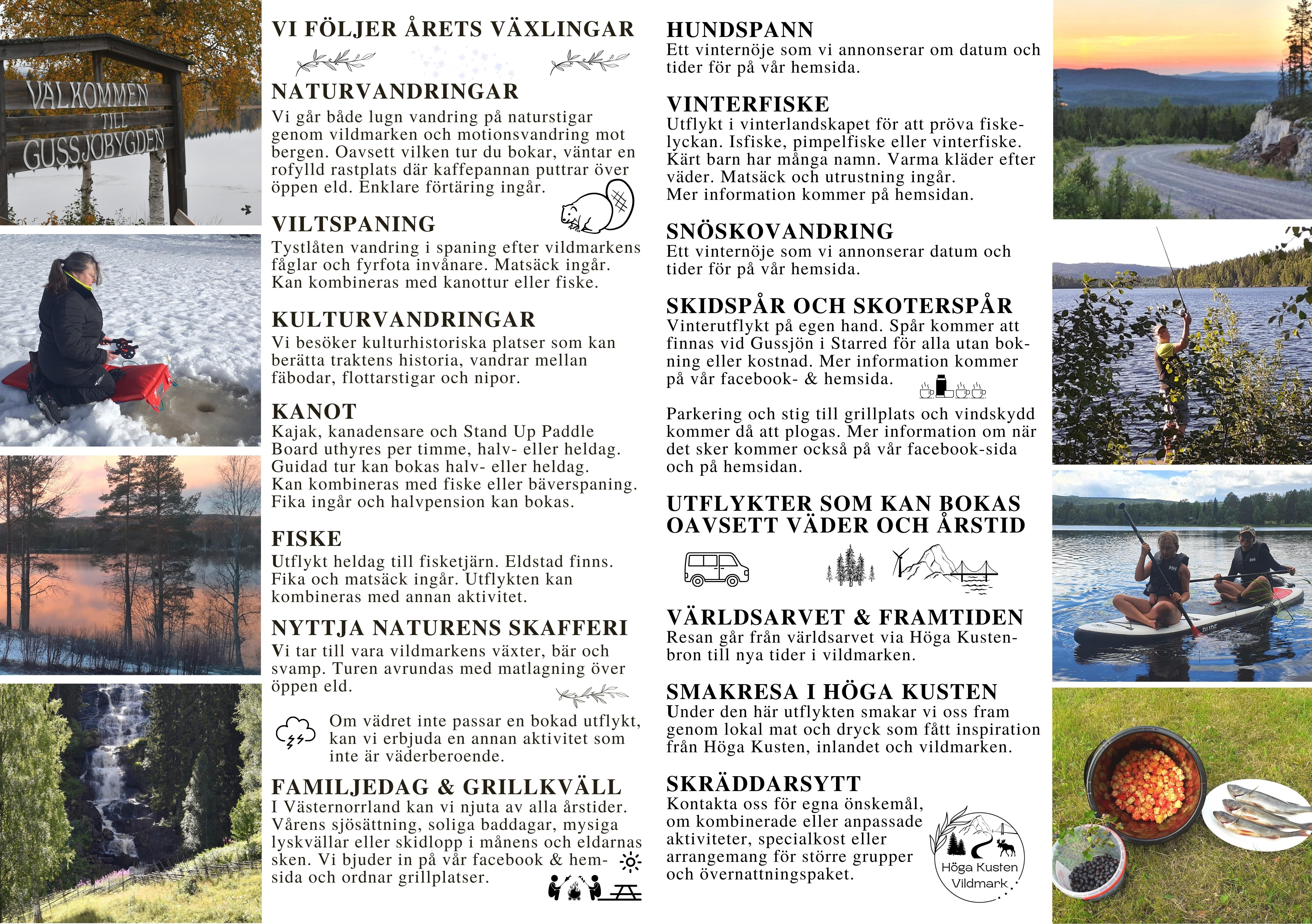 Vi erbjuder guidade turer, vandringar, kanot- och fiskeutflykter. Vintertid görs utflykter med hundspann, häst, skidor eller snöskor.